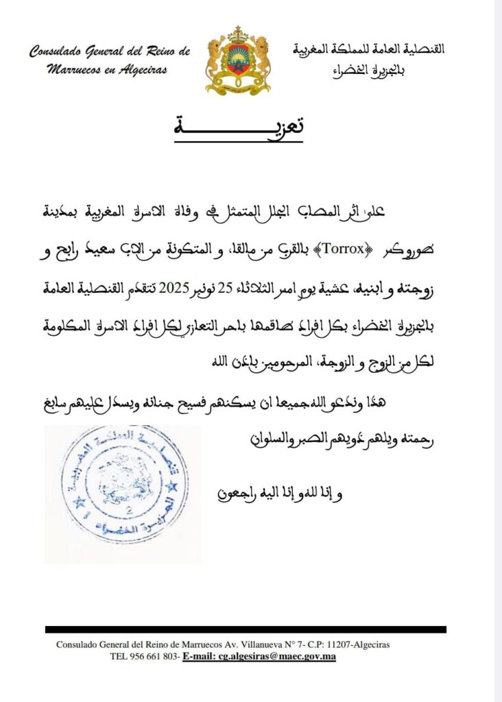 و على إثر المصاب الجلل المتمثل في وفاة الاسرة المغربية بمدينة Torrox, بالقرب من ملقا، و المكونة من الاب سعيد رابح و زوجته و إبنيه، عشية يوم الثلاثاء 25 نونبر 2025، تقدمت القنصلية العامة للمملكة المغربية بالجزيرة الخضراء باسم كل أفراد طاقمها بأحر التعازي لكل أفراد الاسرة المكلومة, داعية الله جميعا ان يسكنهم فسيح جنانه ويسدل عليهم سابغ رحمته و يلهم ذويهم الصبر و السلوان.